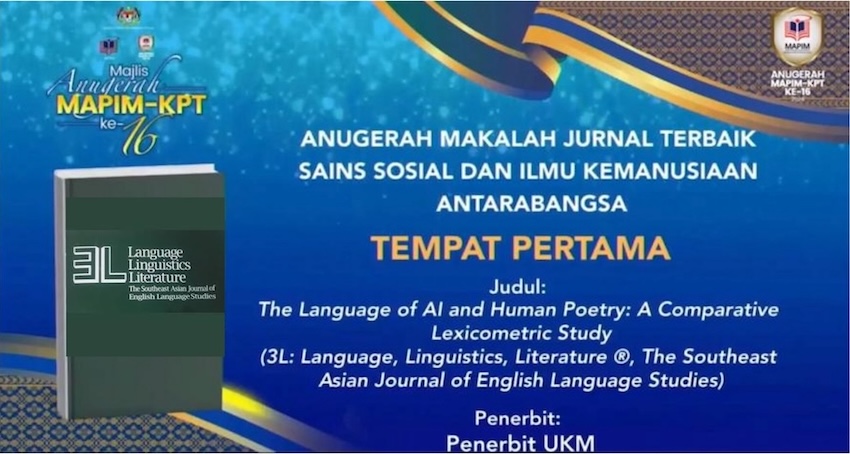 We are pleased to announce that the article titled “The Language of AI and Human Poetry: A Comparative Lexicometric Study” by Assoc. Prof. Dr. Afendi Hamat, published in 3L: Language, Linguistics, Literature® The Southeast Asian Journal of English Language Studies (Vol. 30(3), September 2024), has won the Anugerah MAPIM-KPT ke-16 (16th MAPIM-KPT Award) under the category of Best Journal Article in Humanities and Social Sciences (International Index).